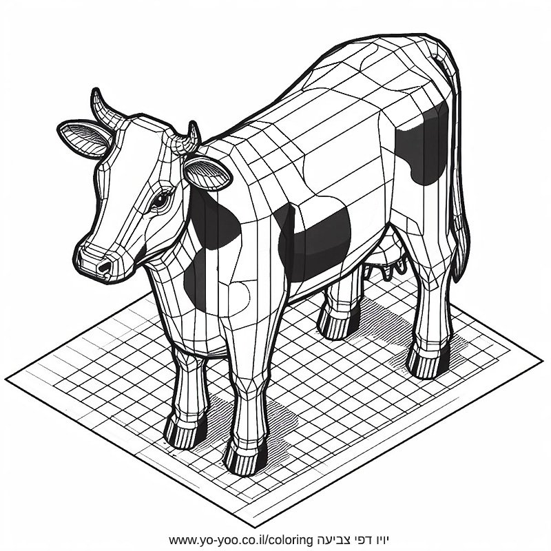 דף צביעה של פרה תלת מימדית להדפסה או להורדה בחינם, למחשב או לטלפון (אפשר להדפיס גם מהטלפון)