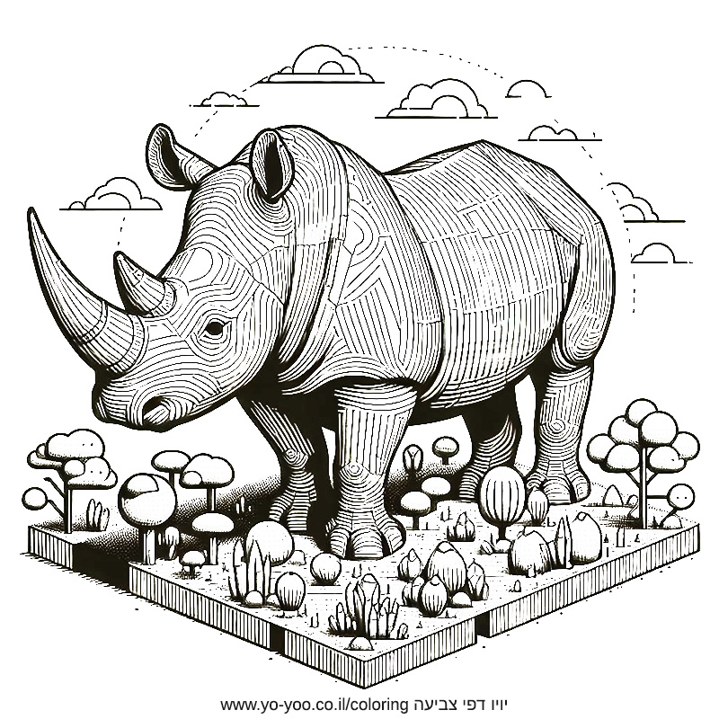 דף צביעה של קרנף תלת מימדי להדפסה או להורדה בחינם, למחשב או לטלפון (אפשר להדפיס גם מהטלפון)