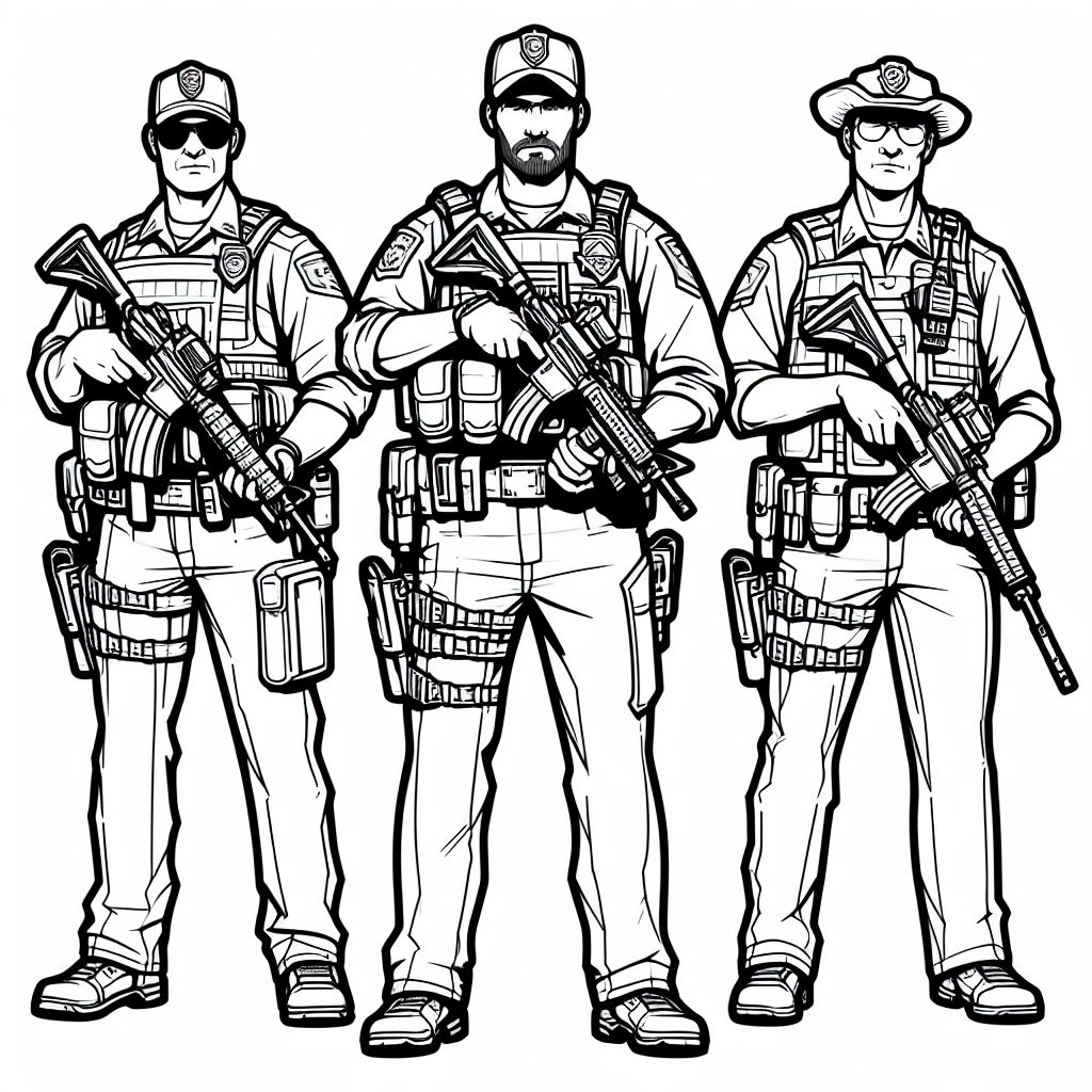 דף צביעה של שוטרים עם רובים להדפסה או להורדה בחינם, למחשב או לטלפון (אפשר להדפיס גם מהטלפון)