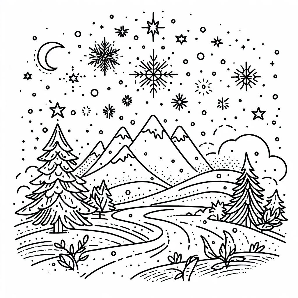 דף צביעה של נוף מושלג להדפסה או להורדה בחינם, למחשב או לטלפון (אפשר להדפיס גם מהטלפון)