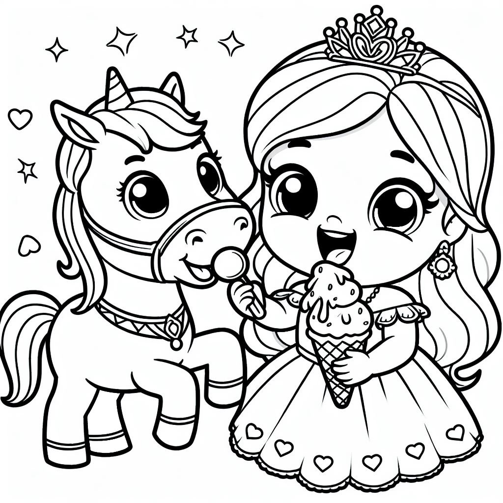 דף צביעה של נסיכה וסוס אוכלים גלידה להדפסה או להורדה בחינם, למחשב או לטלפון (אפשר להדפיס גם מהטלפון) ציור של נסיכה וסוס אוכלים גלידה לצביעה, איור של נסיכה וסוס אוכלים גלידה להדפסה לצביעה לילדים