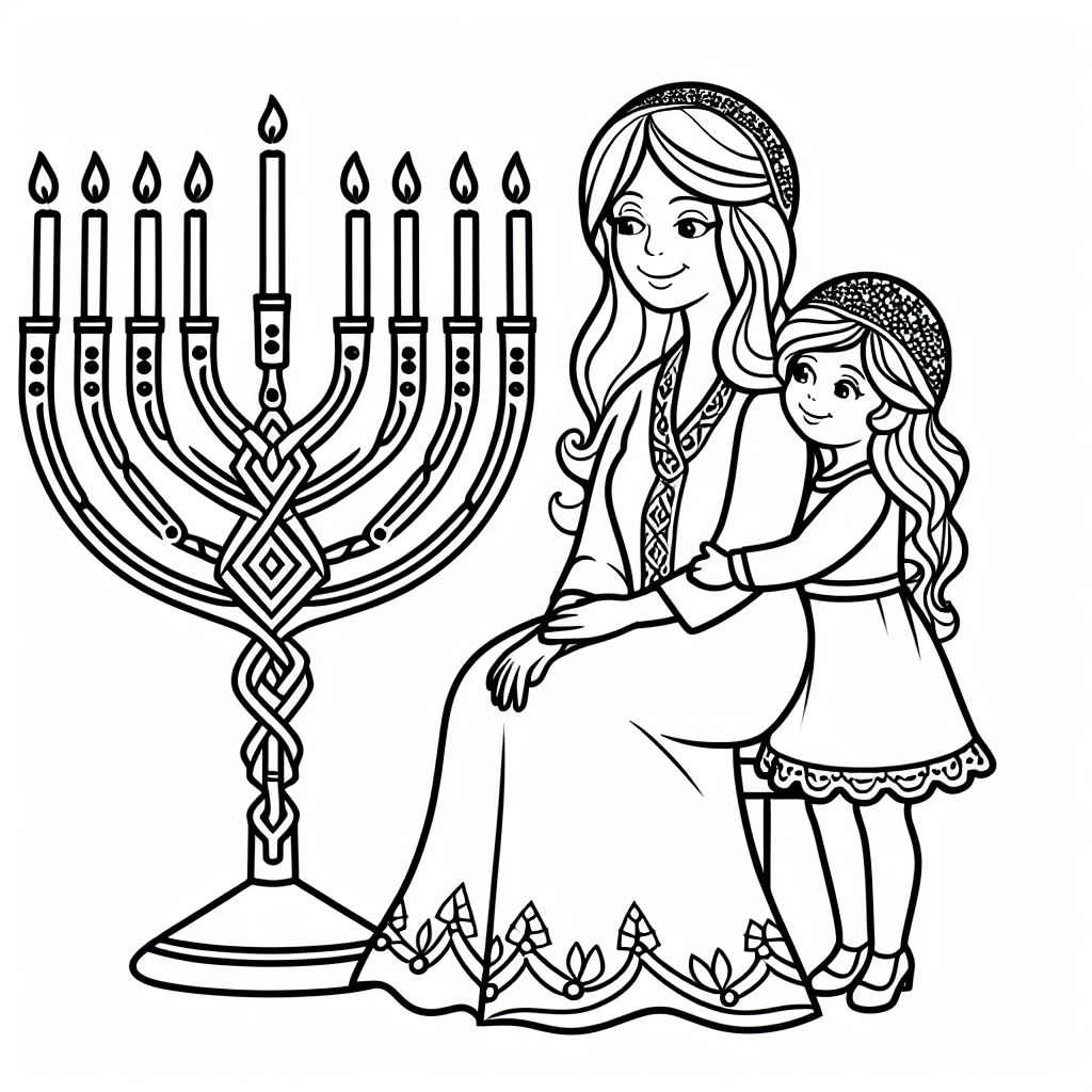 דף צביעה של אמא בת וחנוכייה להדפסה או להורדה בחינם, למחשב או לטלפון (אפשר להדפיס גם מהטלפון) ציור של אמא בת וחנוכייה לצביעה, איור של אמא בת וחנוכייה להדפסה לצביעה לילדים