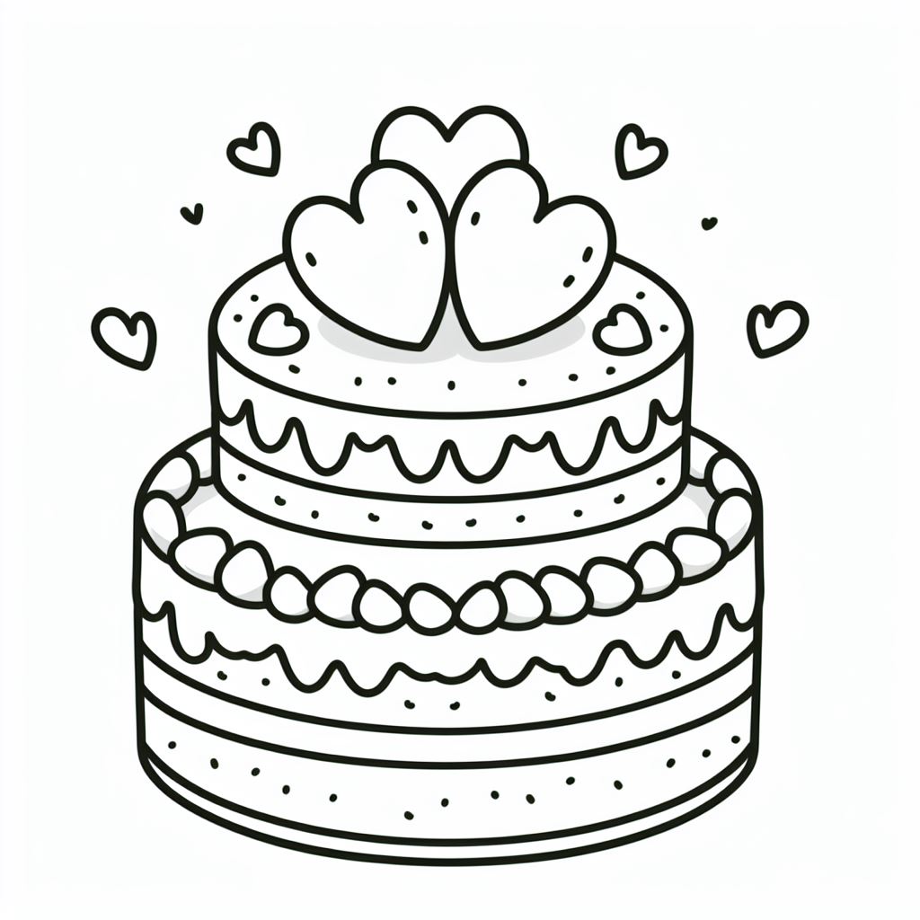 ציור של עוגה עם לבבות לצביעה, איור של עוגה עם לבבות להדפסה לצביעה לילדים