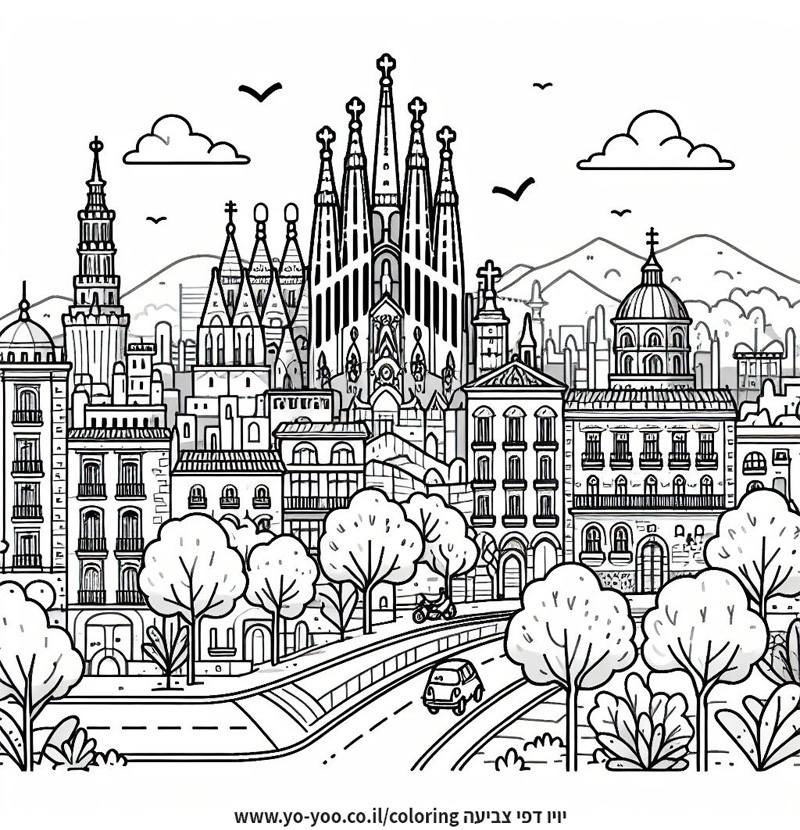 דף צביעה של ברצלונה להדפסה או להורדה בחינם, למחשב או לטלפון (אפשר להדפיס גם מהטלפון)