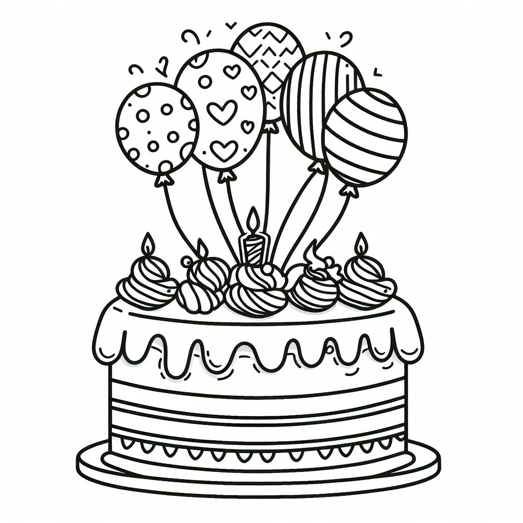ציור של עוגה עם בלונים לצביעה, איור של עוגה עם בלונים להדפסה לצביעה לילדים