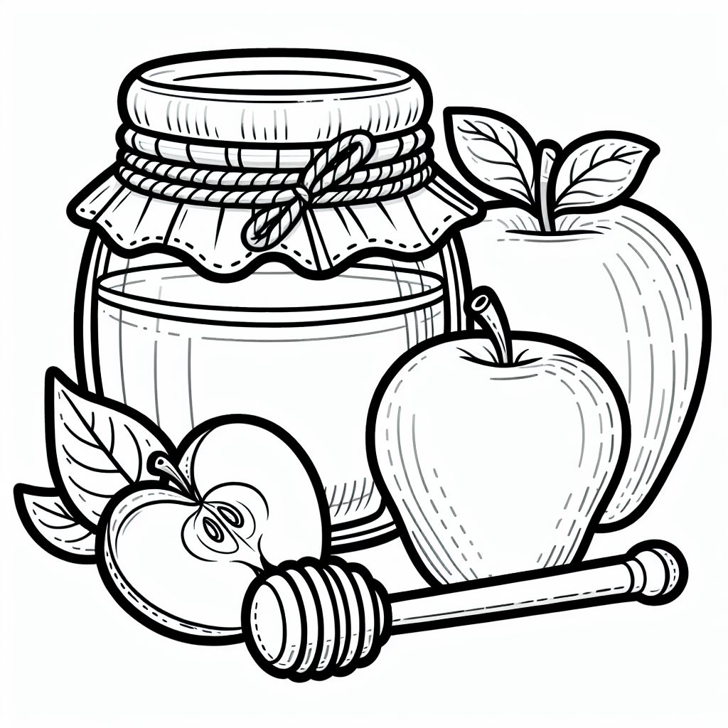 דף צביעה של צנצנת דבש ותפוח להדפסה או להורדה בחינם, למחשב או לטלפון (אפשר להדפיס גם מהטלפון) ציור של צנצנת דבש ותפוח לצביעה, איור של צנצנת דבש ותפוח להדפסה לצביעה לילדים