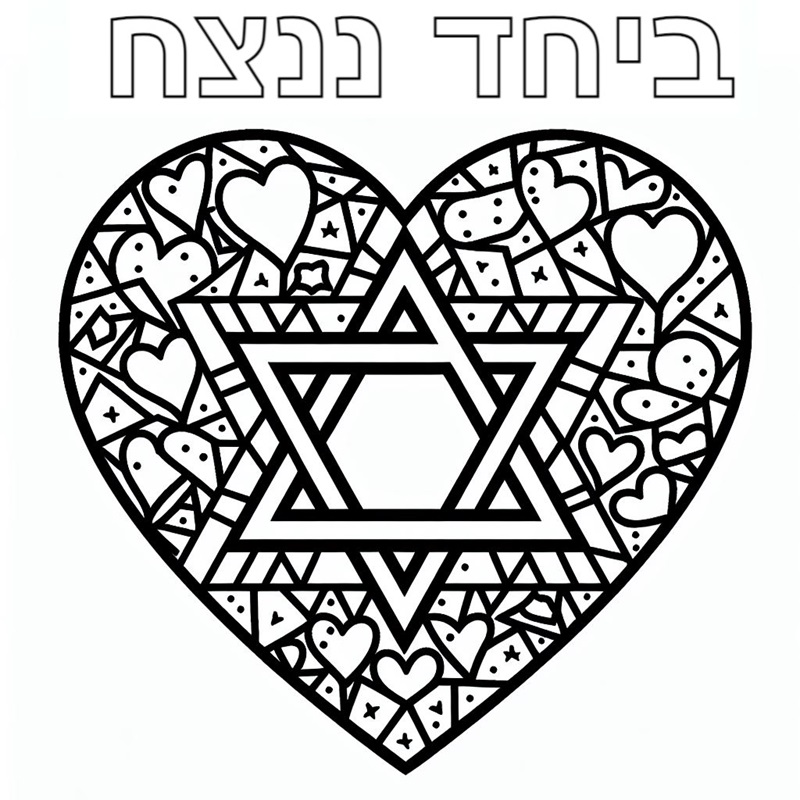 דף צביעה של ביחד ננצח לב מגן דוד להדפסה או להורדה בחינם, למחשב או לטלפון (אפשר להדפיס גם מהטלפון) ציור של ביחד ננצח לב מגן דוד לצביעה, איור של ביחד ננצח לב מגן דוד להדפסה לצביעה לילדים