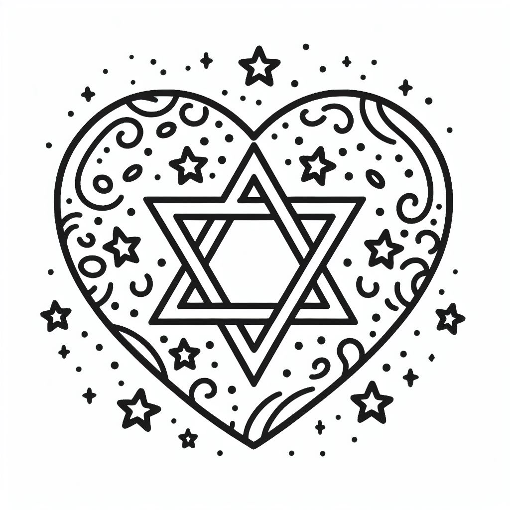 ציור של דגל ישראל לב לצביעה, איור של דגל ישראל לב להדפסה לצביעה לילדים