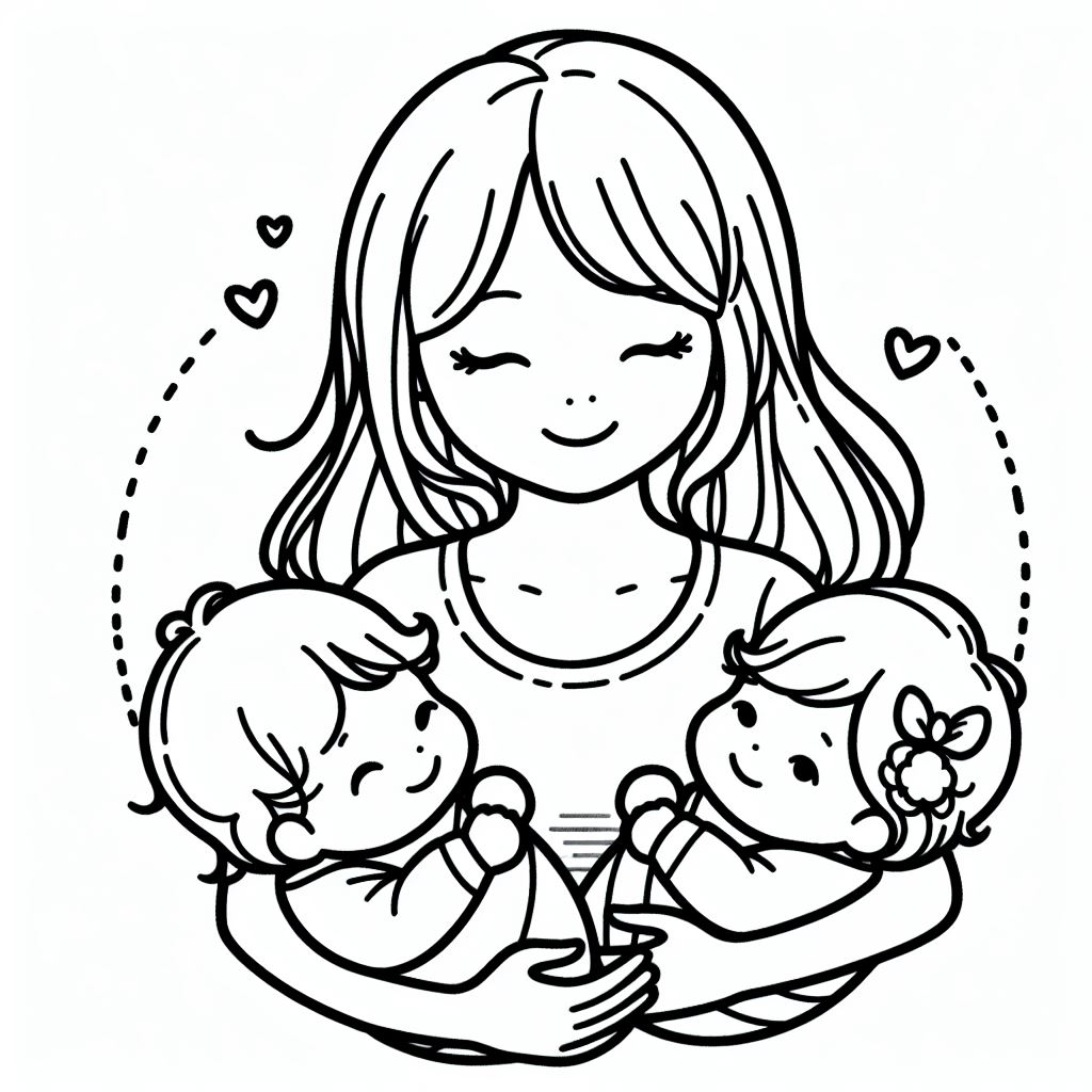 דף צביעה של אמא עם תינוקת ותינוק להדפסה או להורדה בחינם, למחשב או לטלפון (אפשר להדפיס גם מהטלפון) ציור של אמא עם תינוקת ותינוק לצביעה, איור של אמא עם תינוקת ותינוק להדפסה לצביעה לילדים