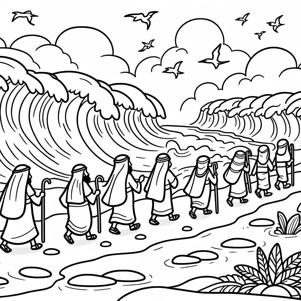 דף צביעה של בני ישראל הולכים בים סוף להדפסה בחינם