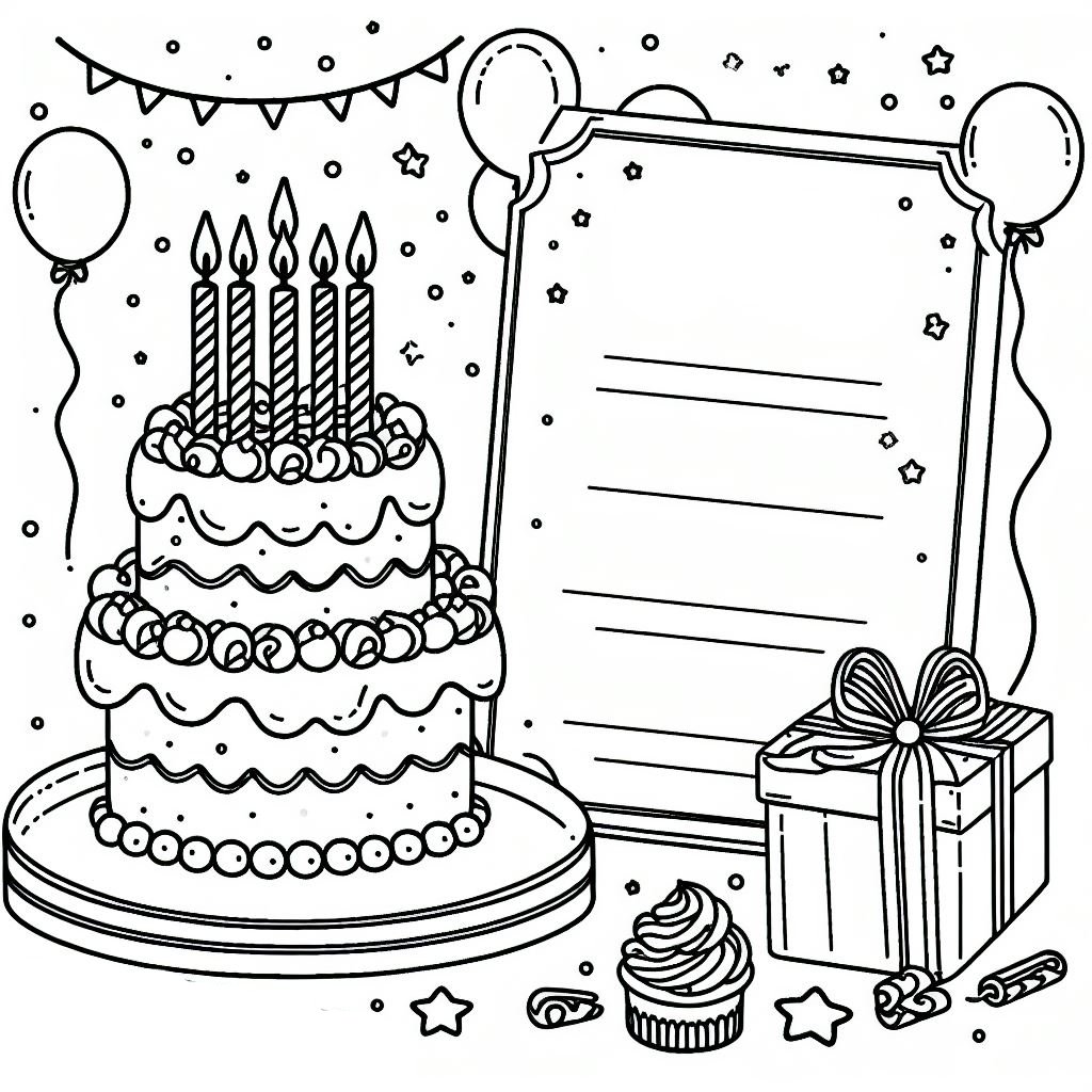 כרטיס ברכה עוגה לצביעה - דף צביעה כרטיס ברכה של עוגה להדפסה, ציור של ברכה של עוגה לצביעה בחינם, כרטיס ברכה עם עוגה לצביעה, הזמנה ליום הולדת עם עוגה להדפסה לצביעה לילדים בחינם