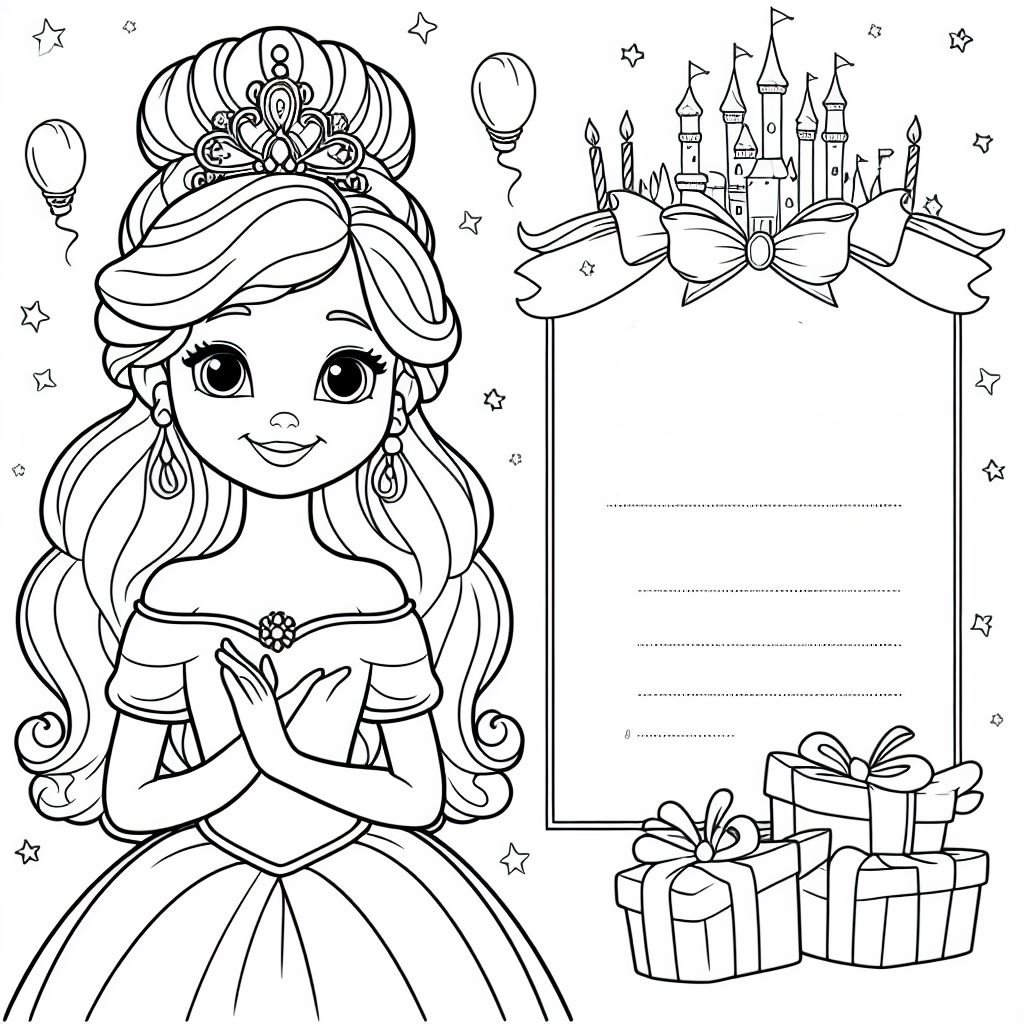 כרטיס ברכה נסיכה לצביעה - דף צביעה כרטיס ברכה של נסיכה להדפסה, ציור של ברכה של נסיכה לצביעה בחינם, כרטיס ברכה עם נסיכה לצביעה, הזמנה ליום הולדת עם נסיכה להדפסה לצביעה לילדים בחינם. דף צביעה להדפסה או להורדה בחינם ! כנסו והתחילו לצבוע !