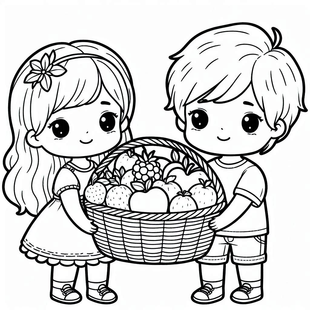 ילדים עם טנא לצביעה - דף צביעה של ילדים עם טנא להדפסה, ציור של ילדים עם טנא לצביעה בחינם