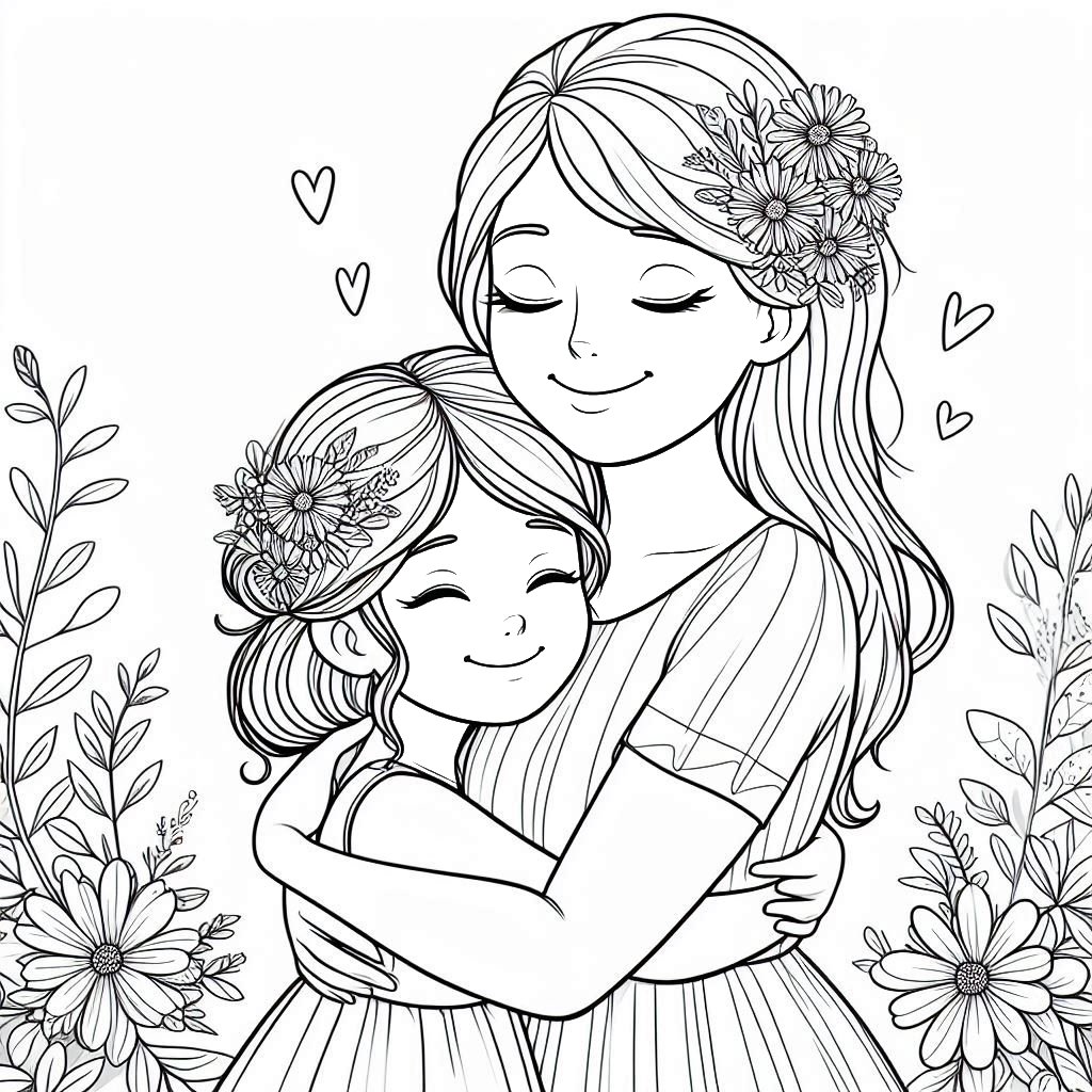 ציור של חיבוק של אמא ובת לצביעה, איור של חיבוק של אמא ובת להדפסה לצביעה לילדים