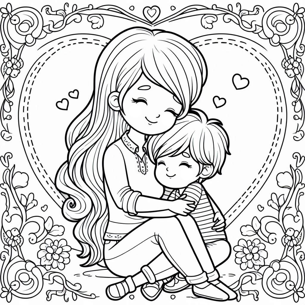 ציור של חיבוק אמא ובן לצביעה, איור של חיבוק אמא ובן להדפסה לצביעה לילדים