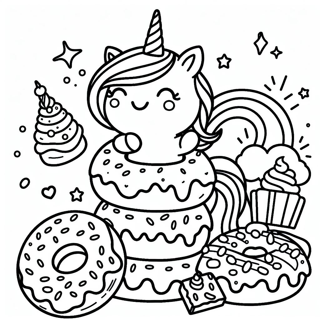 דף צביעה תמונה של דונאטס חד קרן לצביעה בחינם להדפסה או צביעה אונליין
