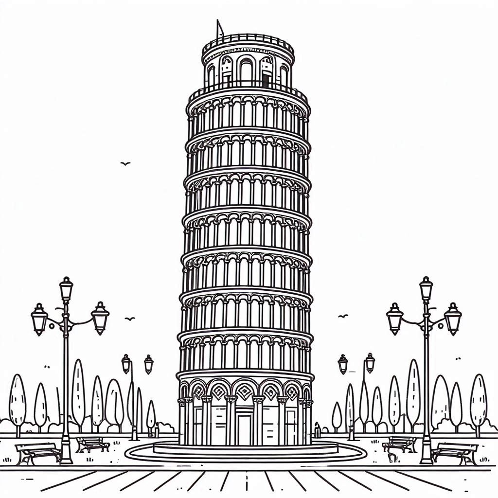 ציור של מגדל פיזה לצביעה, איור של מגדל פיזה להדפסה לצביעה לילדים