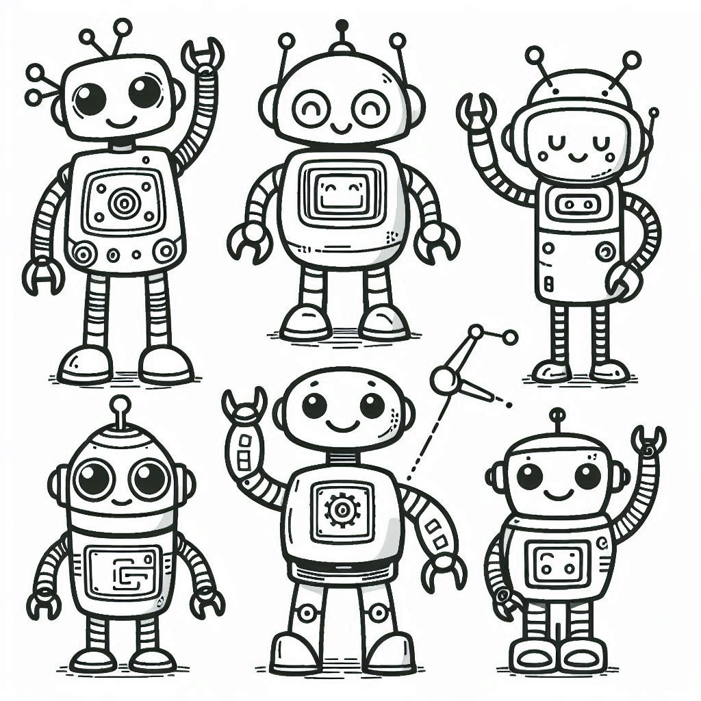 דף צביעה של רובוטים ידידותיים להדפסה או להורדה בחינם, למחשב או לטלפון (אפשר להדפיס גם מהטלפון) ציור של רובוטים ידידותיים לצביעה, איור של רובוטים ידידותיים להדפסה לצביעה לילדים