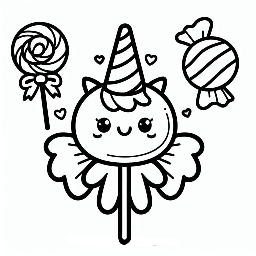 דף צביעה תמונה של סוכריה על מקל חד קרן לצביעה בחינם להדפסה או צביעה אונליין