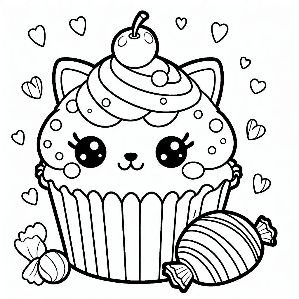 ציור של קאפקייק חתול לצביעה, איור של קאפקייק חתול להדפסה לצביעה לילדים