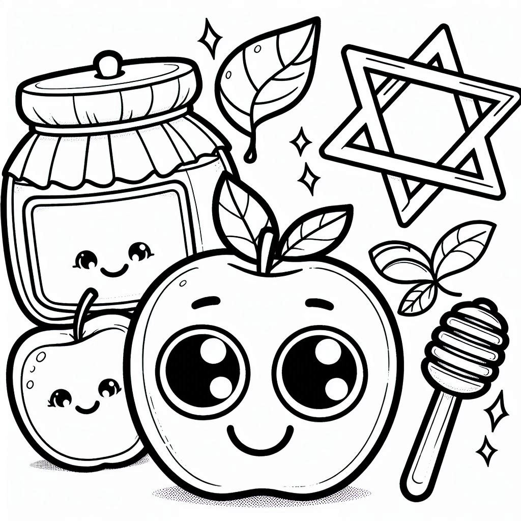 דף צביעה לראש השנה - דף צביעה לראש השנה להדפסה, ציור לראש השנה לצביעה בחינם, עם תפוח בדבש, מגן דוד, צנצנת דבש, ציור חמוד לילדים לראש השנה. דף צביעה להדפסה או להורדה בחינם ! כנסו והתחילו לצבוע !