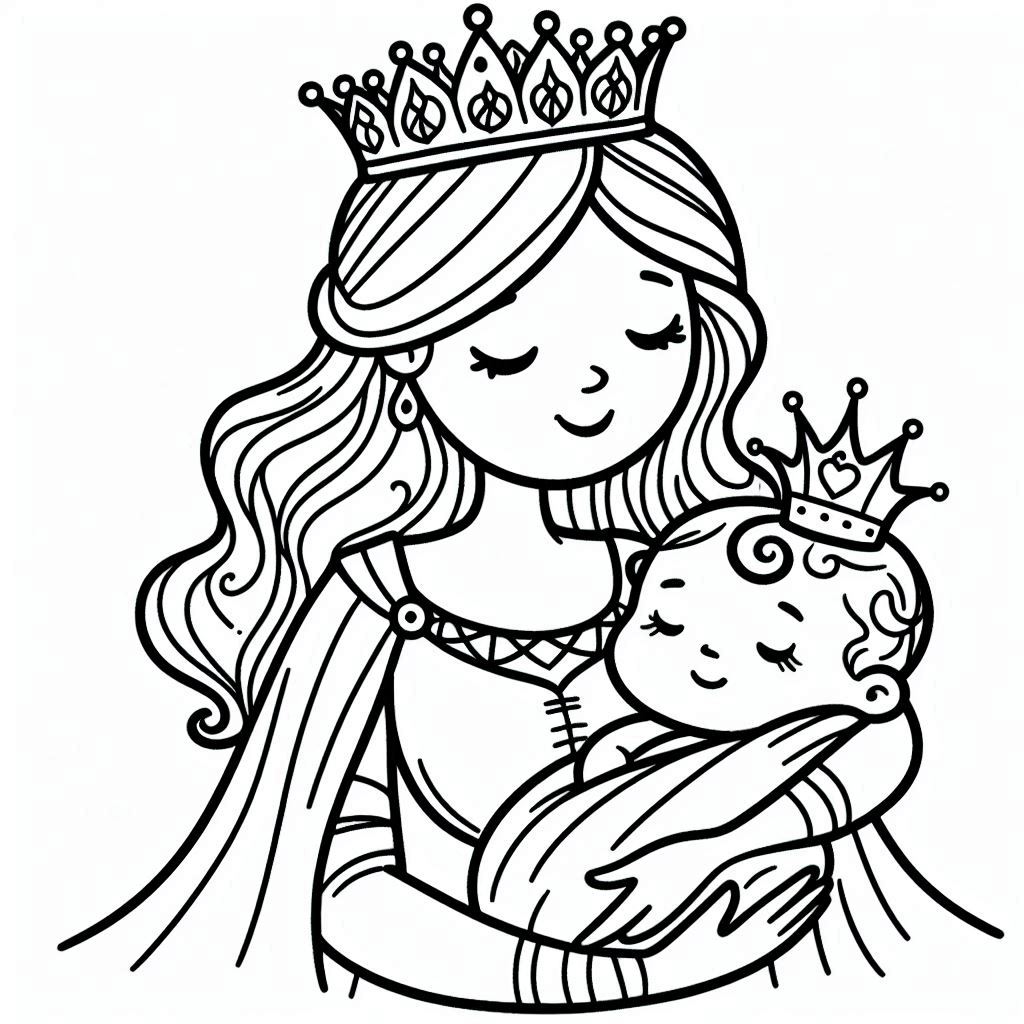 ציור של מלכה עם תינוק לצביעה, איור של מלכה עם תינוק להדפסה לצביעה לילדים