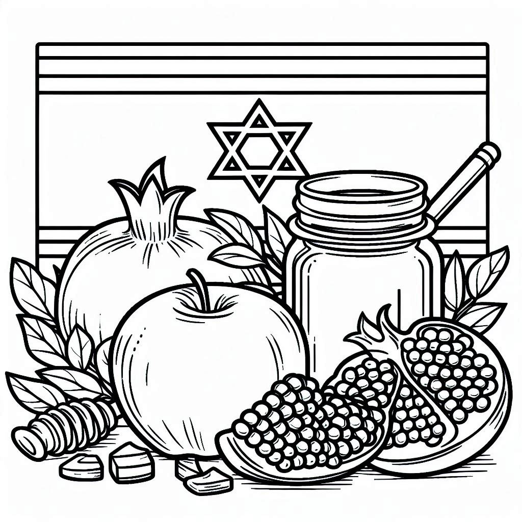 דף צביעה לראש השנה - דף צביעה לראש השנה להדפסה, ציור של לראש השנה לצביעה בחינם, עם תפוח בדבש, רימונים ודגל ישראל ברקע. דף צביעה להדפסה או להורדה בחינם ! כנסו והתחילו לצבוע !