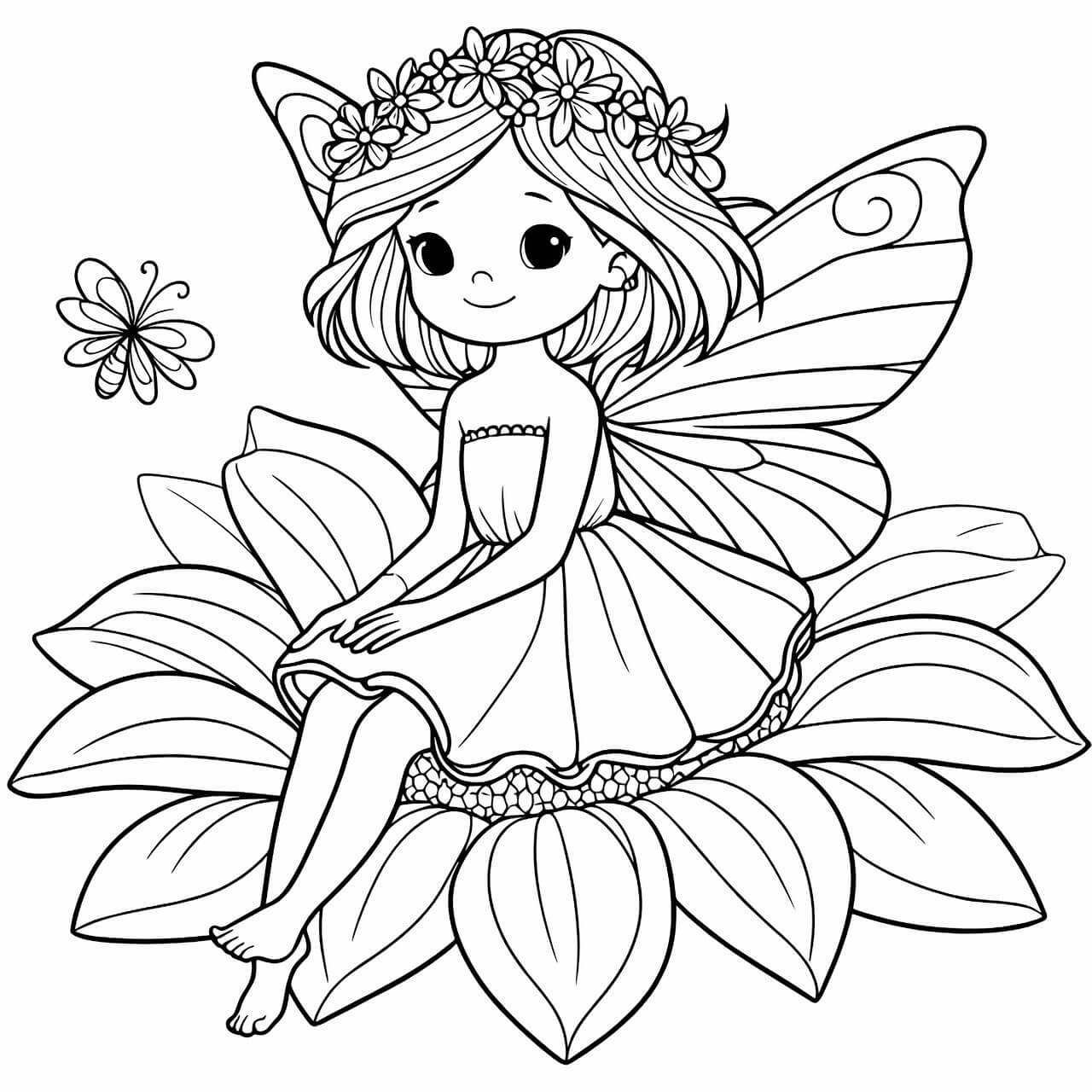 דף צביעה תמונה של פיה יושבת על פרח לצביעה בחינם להדפסה או צביעה אונליין