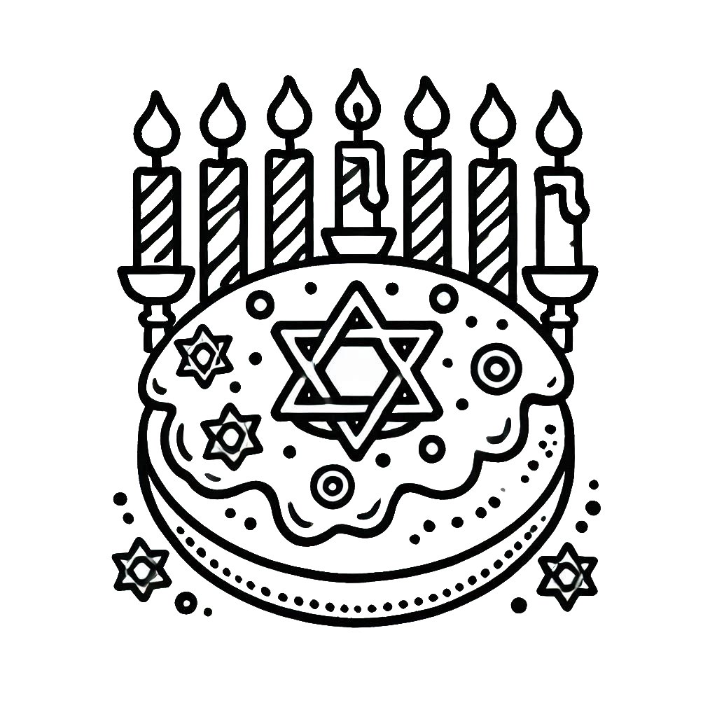 דף צביעה של נרות וסופגניה להדפסה או להורדה בחינם, למחשב או לטלפון (אפשר להדפיס גם מהטלפון) ציור של נרות וסופגניה לצביעה, איור של נרות וסופגניה להדפסה לצביעה לילדים