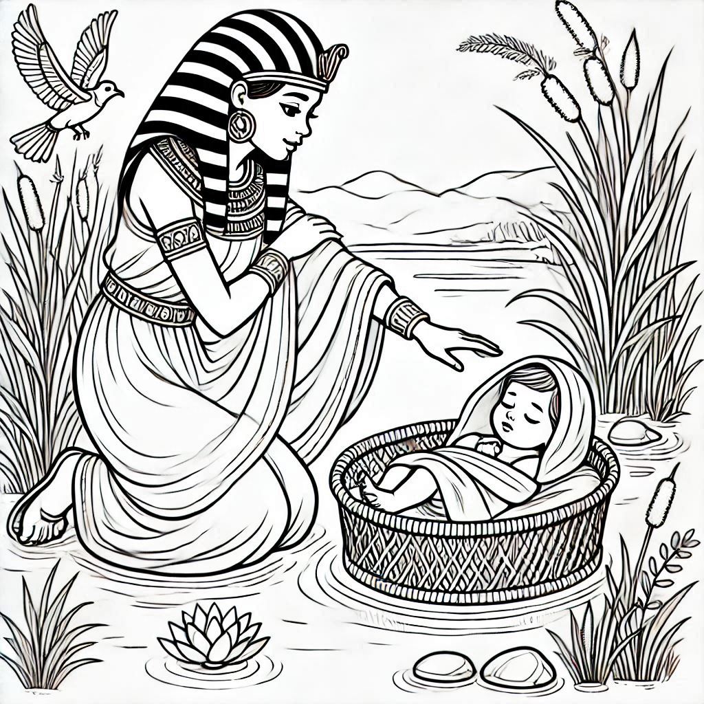 ציור של משה בתיבה ביאור לצביעה, איור של משה בתיבה ביאור להדפסה לצביעה לילדים