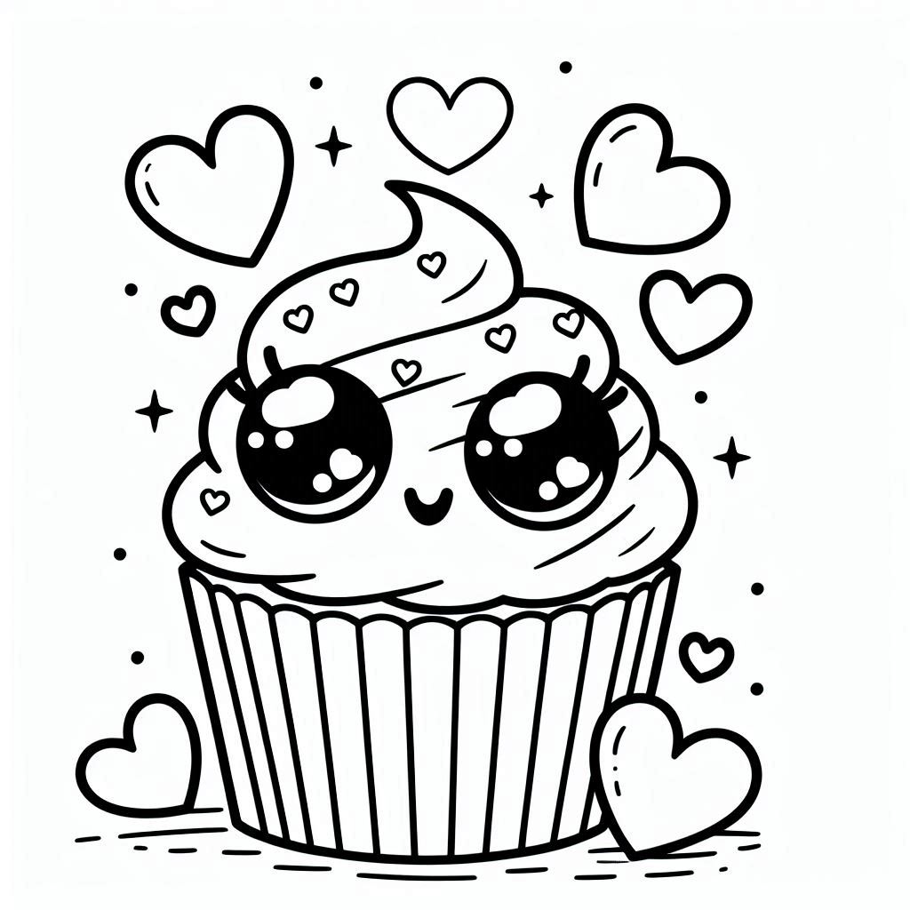 דף צביעה תמונה של קאפקייק חמוד עם לבבות לצביעה בחינם להדפסה או צביעה אונליין