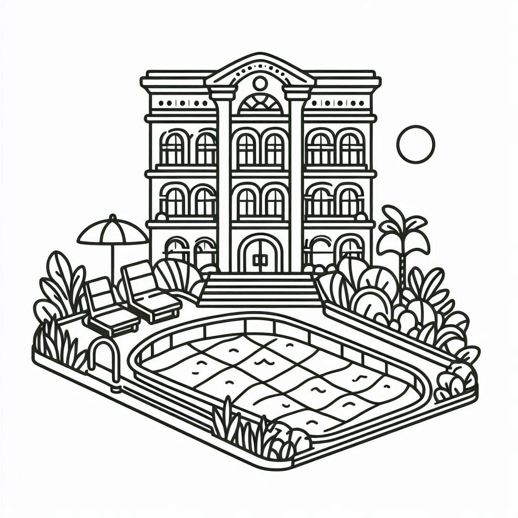 ציור של מלון עם בריכה לצביעה, איור של מלון עם בריכה להדפסה לצביעה לילדים