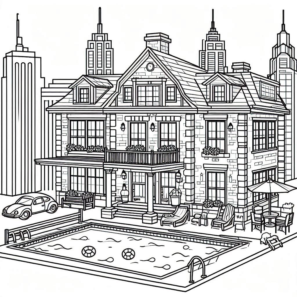 דף צביעה של בית מלון עם בריכה להדפסה או להורדה בחינם, למחשב או לטלפון (אפשר להדפיס גם מהטלפון)