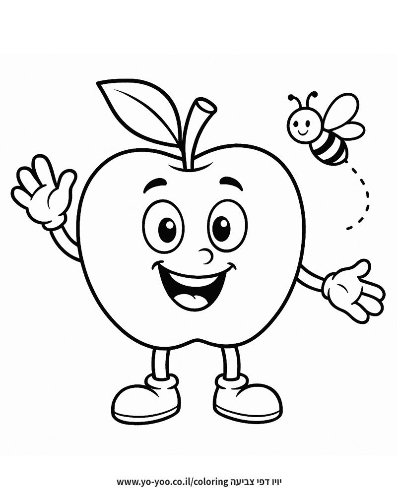 דף צביעה של תפוח ודבורה לראש השנה להדפסה או להורדה בחינם, למחשב או לטלפון (אפשר להדפיס גם מהטלפון) ציור של תפוח ודבורה לראש השנה לצביעה, איור של תפוח ודבורה לראש השנה להדפסה לצביעה לילדים