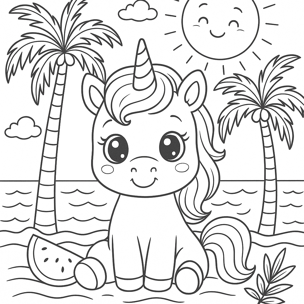 דף צביעה של חד קרן בקיץ להדפסה או להורדה בחינם, למחשב או לטלפון (אפשר להדפיס גם מהטלפון)
