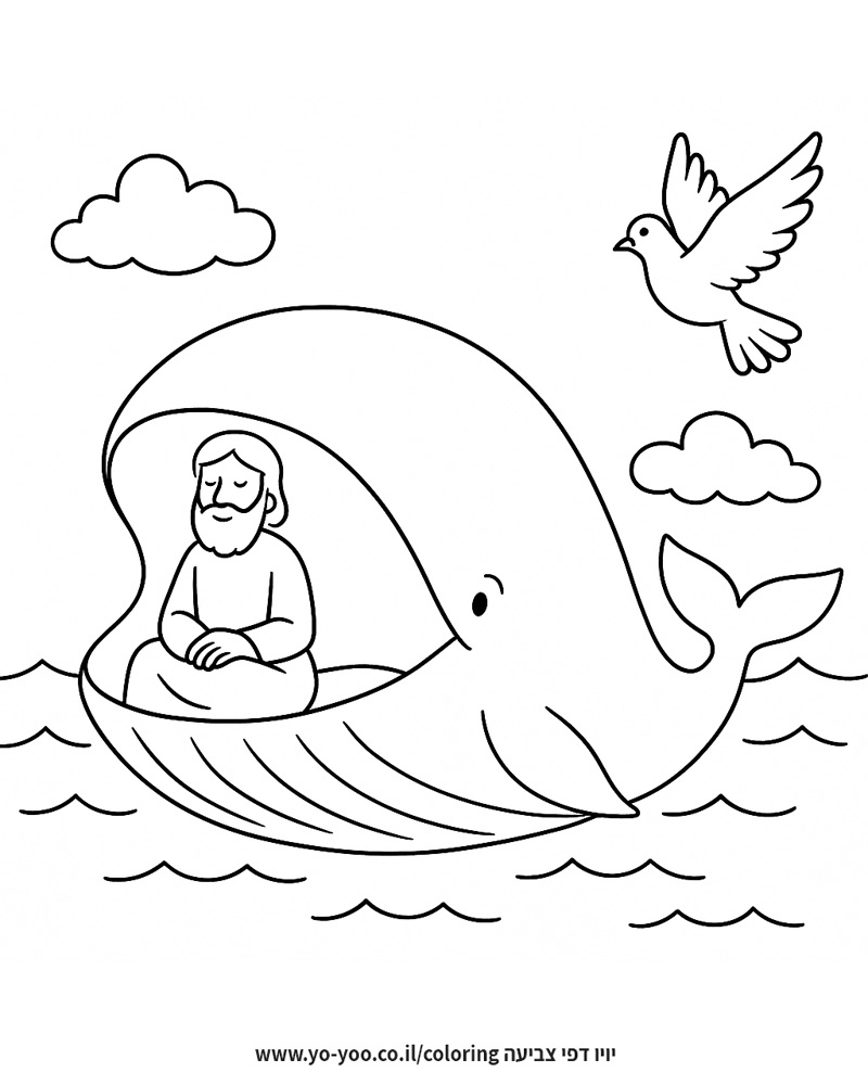 דף יונה והלוויתן לצביעה , יונה והלוויתן להדפסה לצביעה, מתאים לדף בגודל A4 להדפסה בחינם