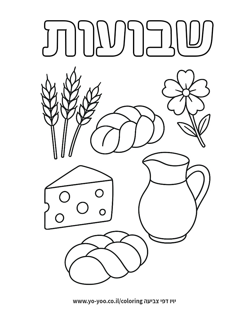 דף צביעה של מאכלים לשבועות להדפסה או להורדה בחינם, למחשב או לטלפון (אפשר להדפיס גם מהטלפון) ציור של מאכלים לשבועות לצביעה, איור של מאכלים לשבועות להדפסה לצביעה לילדים
