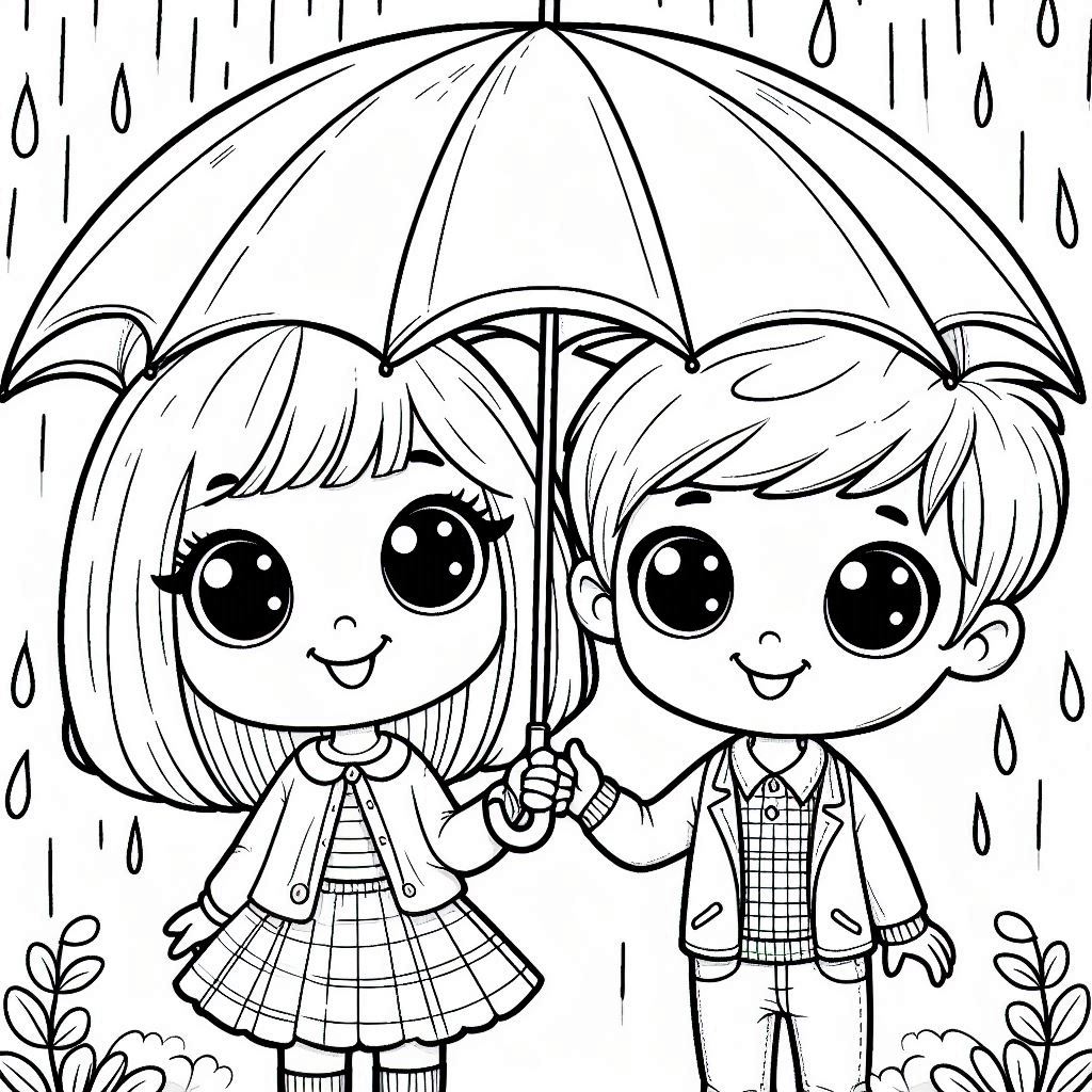 ילדים עם מטריה לצביעה - דף צביעה של ילדים עם מטריה להדפסה, ציור של ילדים עם מטריה לצביעה בחינם