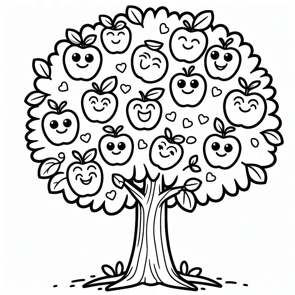 ציור של עץ עם תפוחים לצביעה, איור של עץ עם תפוחים להדפסה לצביעה לילדים