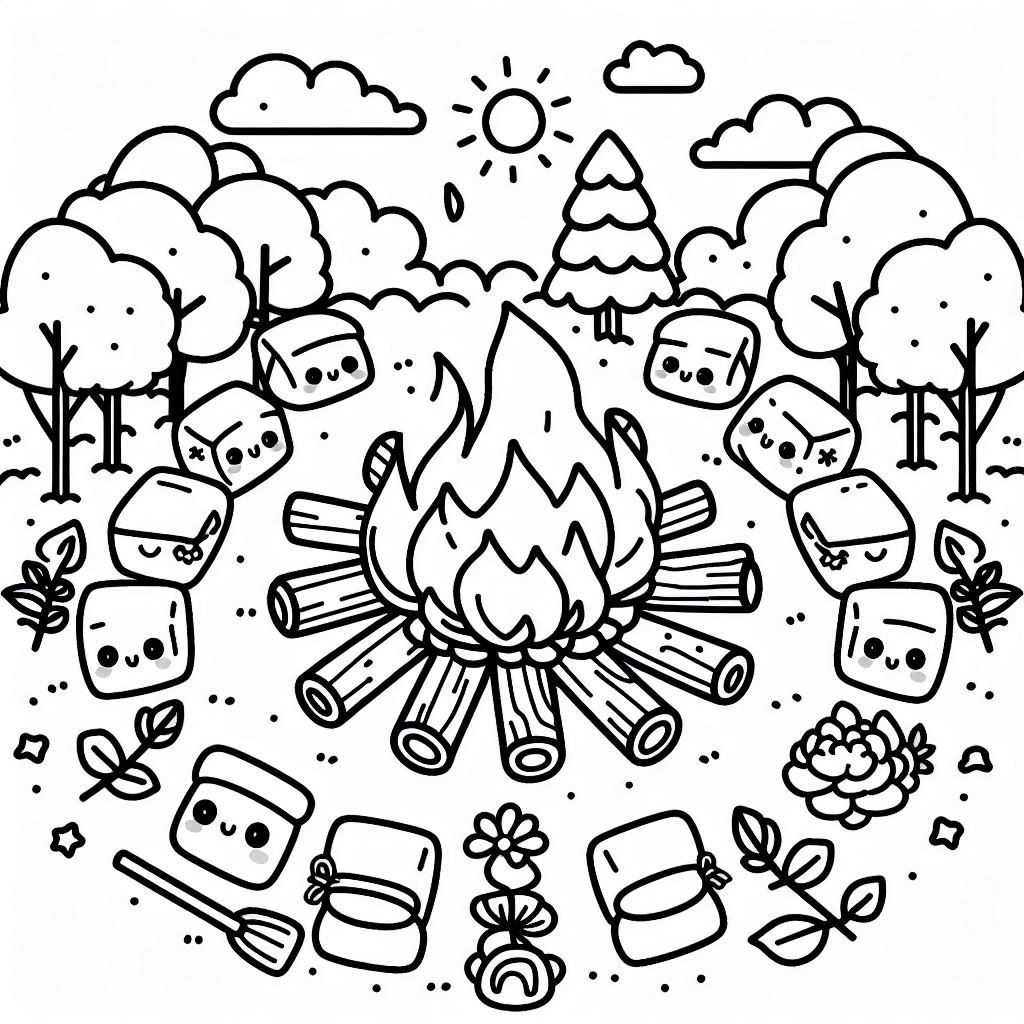 דף צביעה של מרשמלו ומדורה להדפסה בחינם