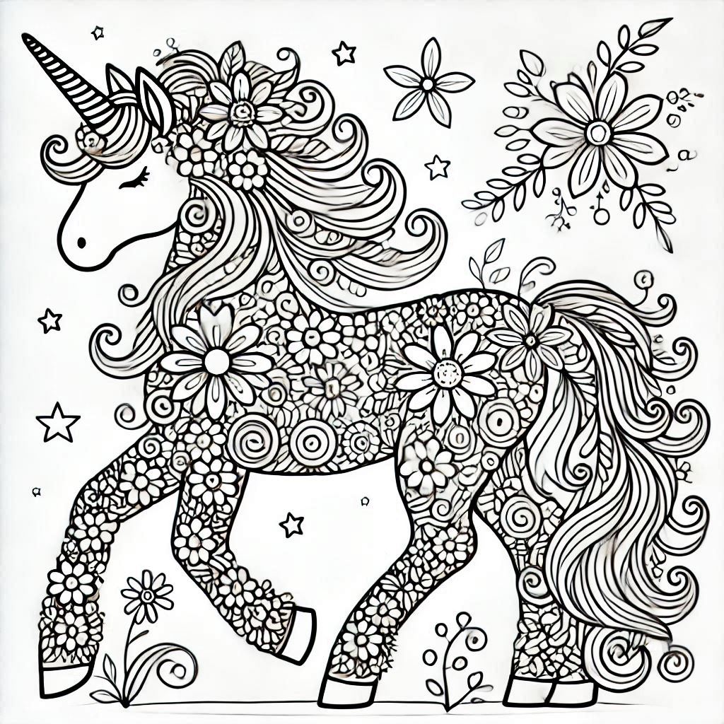 ציור של מנדלה חד קרן לצביעה, איור של מנדלה חד קרן להדפסה לצביעה לילדים