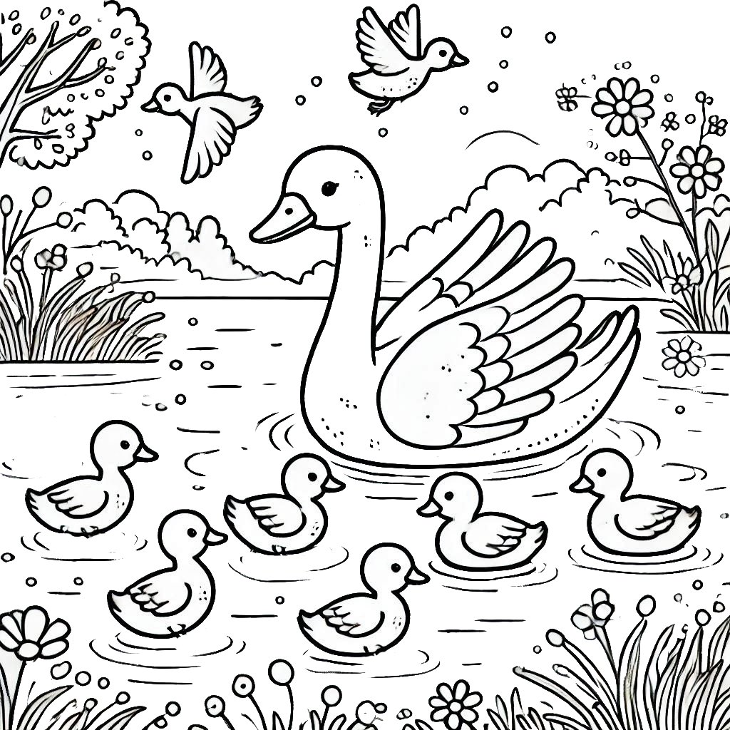 דף צביעה להדפסה או להורדה חינם של אמא ברווזה וברווזים