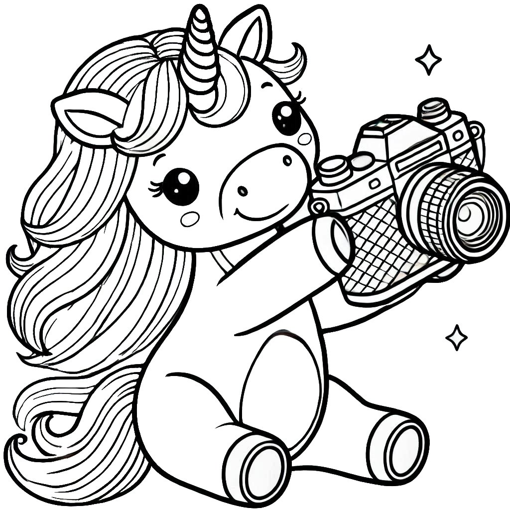 דף צביעה תמונה של חד קרן עם מצלמה לצביעה בחינם להדפסה או צביעה אונליין