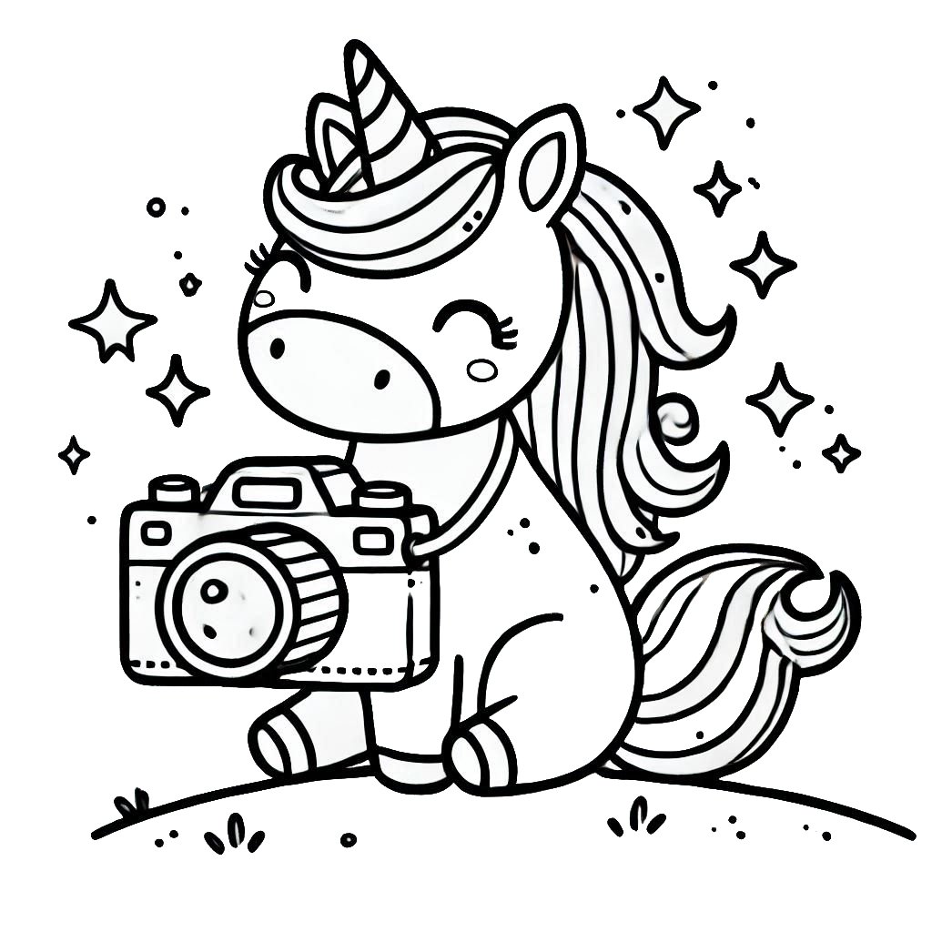 דף צביעה תמונה של חד קרן ומצלמה לצביעה בחינם להדפסה או צביעה אונליין