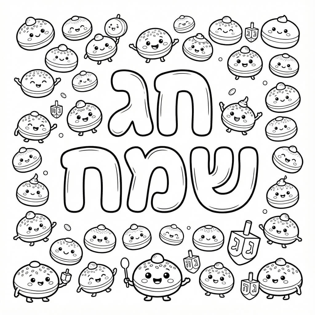 דף צביעה של חג שמח עם סופגניות לחנוכה להדפסה או להורדה בחינם, למחשב או לטלפון (אפשר להדפיס גם מהטלפון) ציור של חג שמח עם סופגניות לחנוכה לצביעה, איור של חג שמח עם סופגניות לחנוכה להדפסה לצביעה לילדים