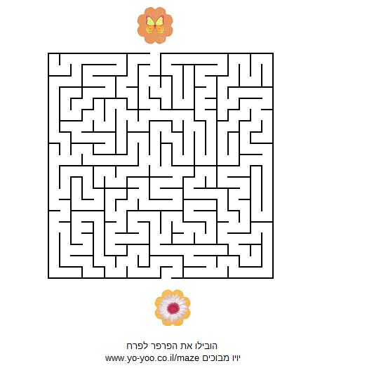 1. לחצו על כפתור "הדפסת מבוך" - הדפיסו ופתרו את המבוך 2.מבוך להדפסה במחשב - לחצו העתק על המבוך והדביקו בתוכנת בוורד או תוכנה אחרת במחשב 3.מבוך להורדה - ניתן להוריד את המבוך למחשב ולהדפיס 4. הורידו למחשב, פתחו באמצעות תוכנת צייר ופתרו |
